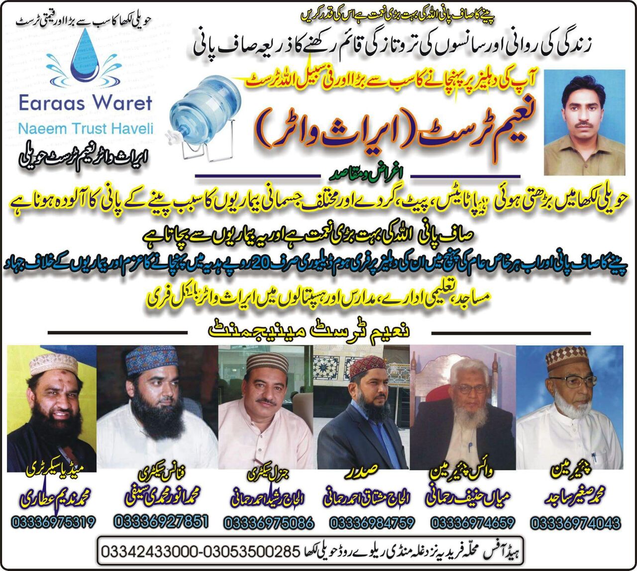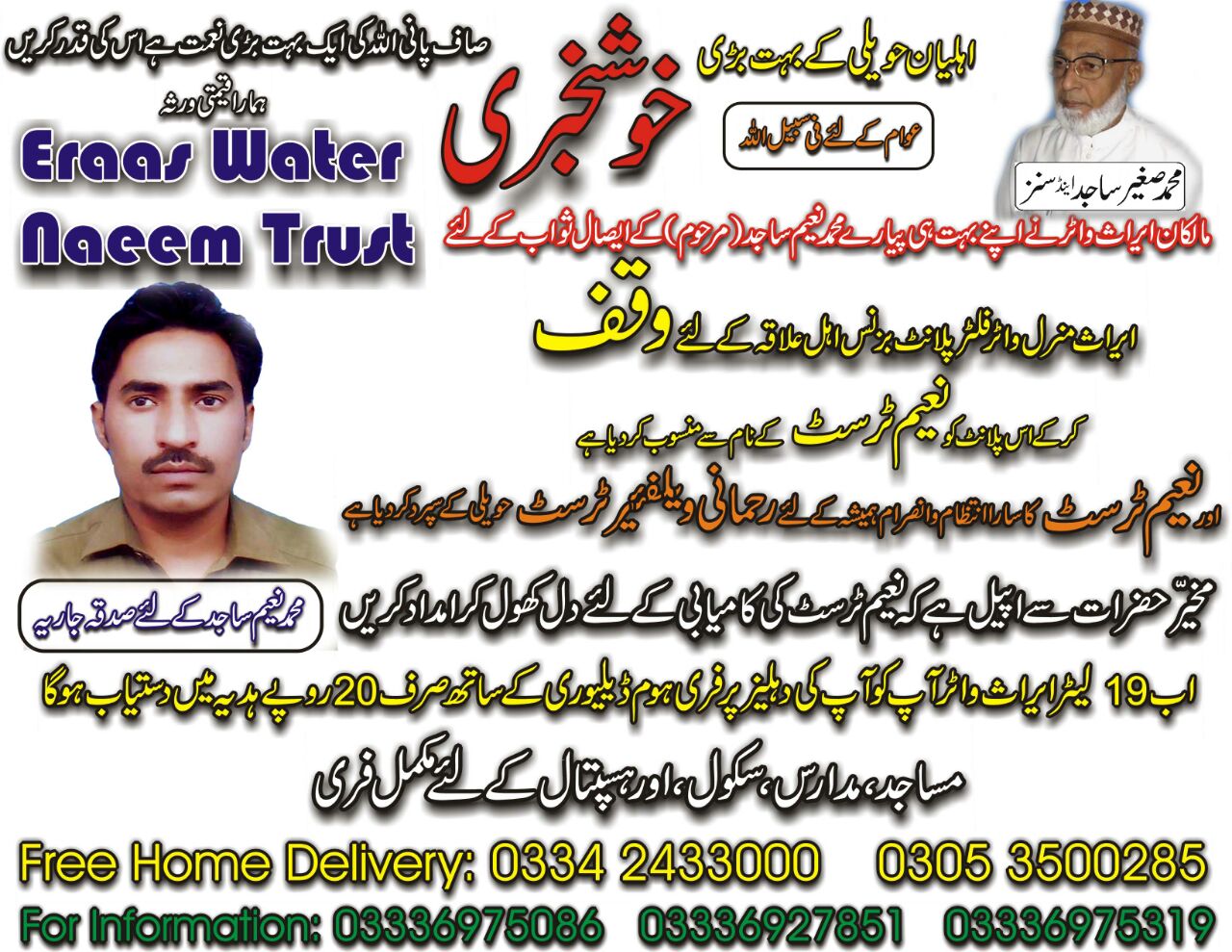We, M. Sagheer Sajid & Sons, are proud to be our beloved M. Naeem sajid (X), and donated the Eraas Mineral Water to the People of Haveli Lakha, District Okara, Pakistan. Trust team has been finalized. Trust memnbers has decided to provide 19L mineral water to the people of Haveli Lakha at door step at the cost (Hadya) of Rs.20 with the aim and ease to get the running finances of the trust with no profit at all. Moreover, mineral water will be provided free of cost to the academic institutes and religious places. May Allah bless Naeem Sajid with highest ranks in Jannah (Ameen). And may Allah bless all the members of trust, their families, Naeem's Family and friends, and all other concerns of the Eraas Water. Ameen
